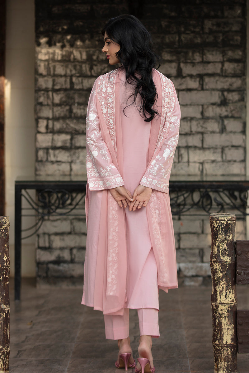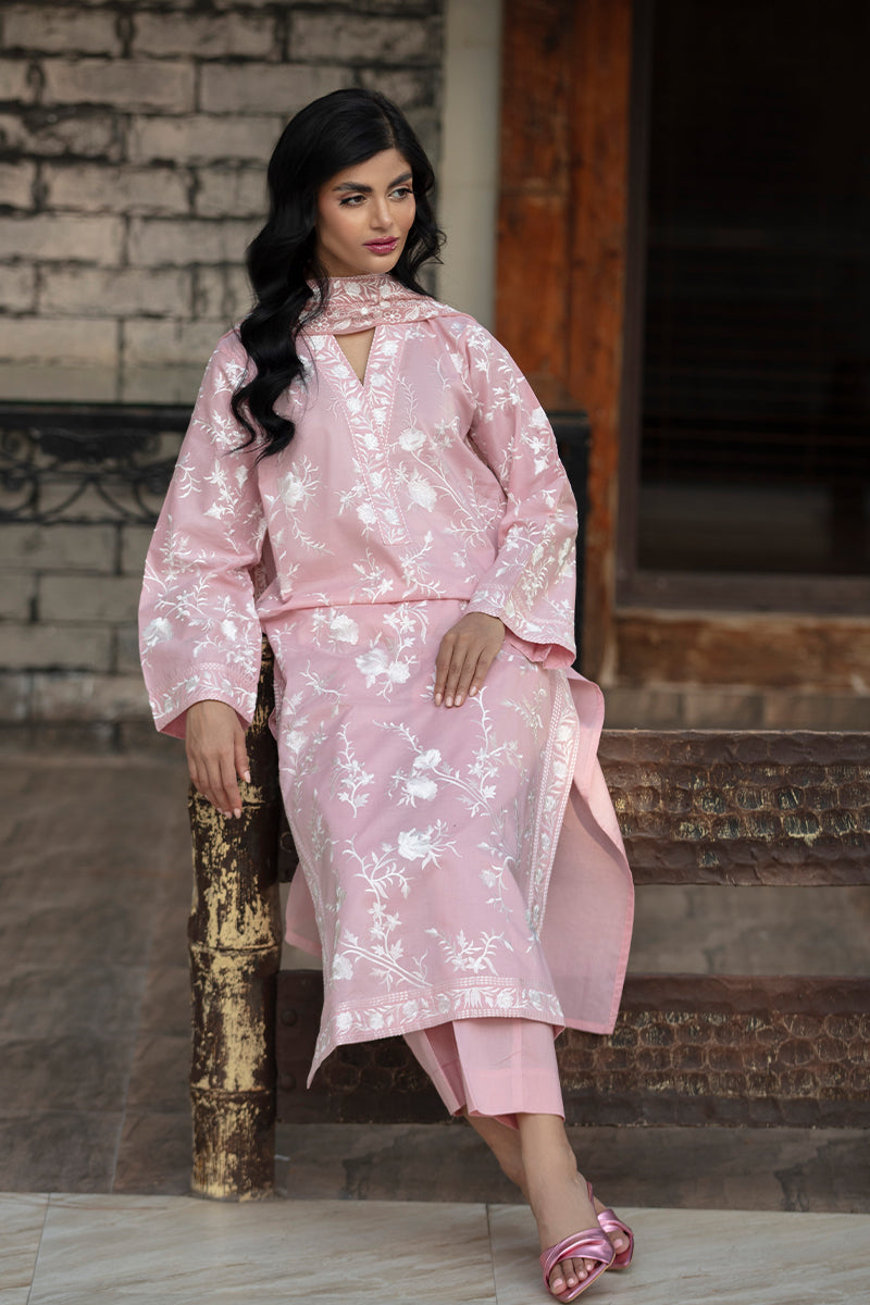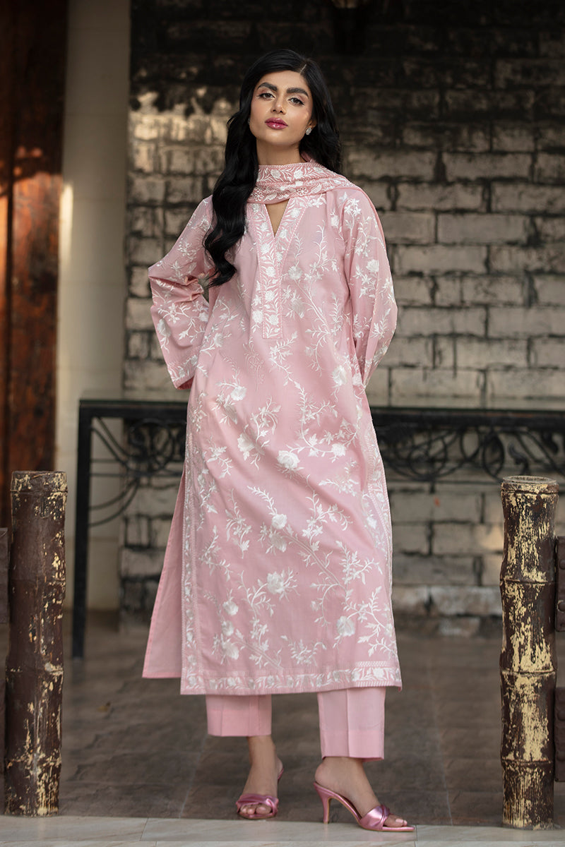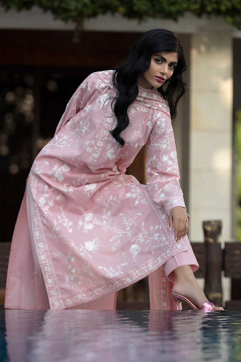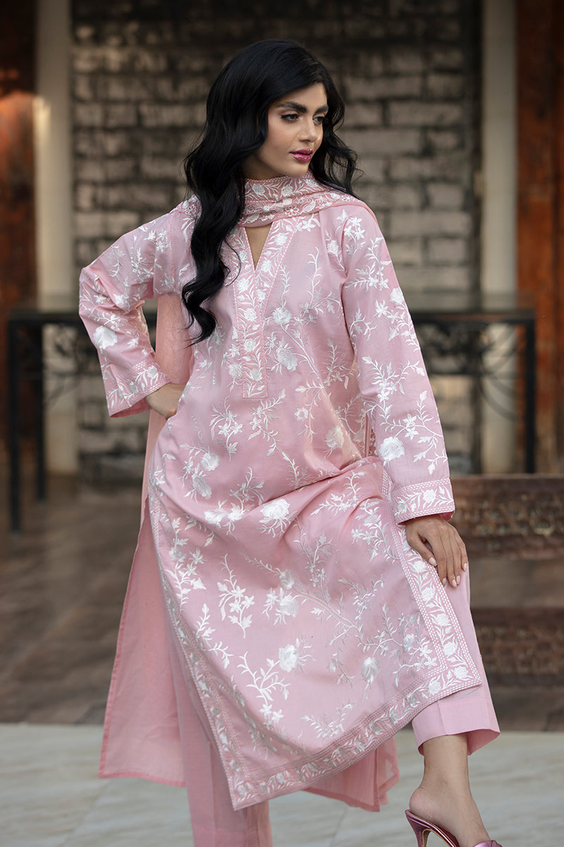 Woman wearing a pink floral dress standing against a stone wall.