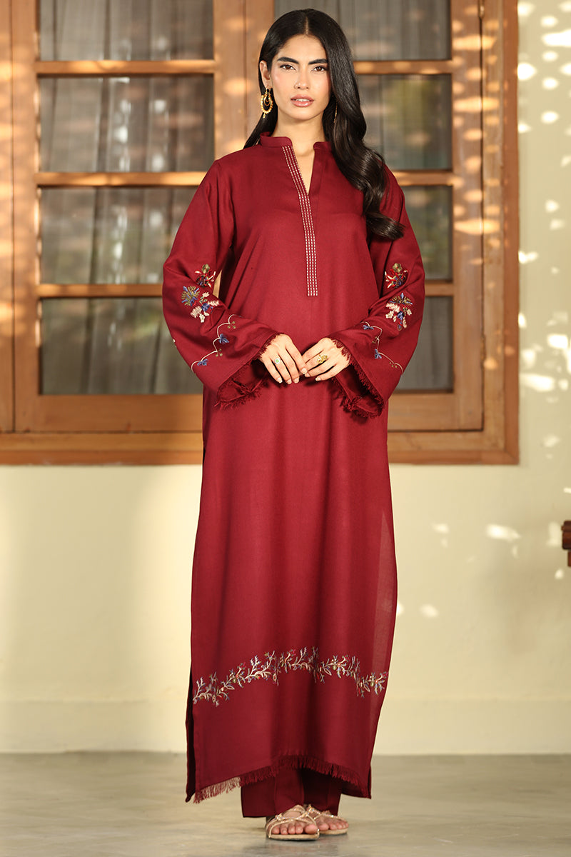 This look perfectly demonstrates the power of a rich, solid jewel tone combined with minimalistic, detailed embroidery.The deep maroon color provides an instantly luxurious and flattering base, while the long, flowing silhouette offers a chic, modern interpretation of traditional wear.