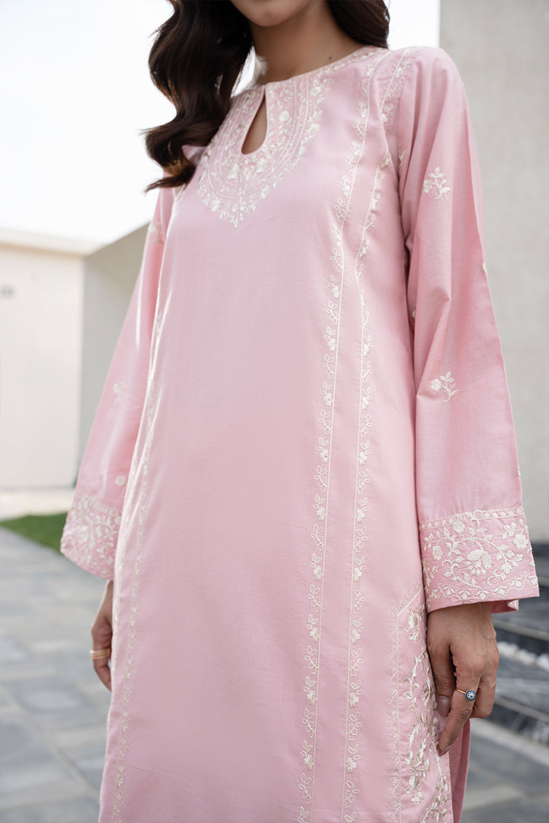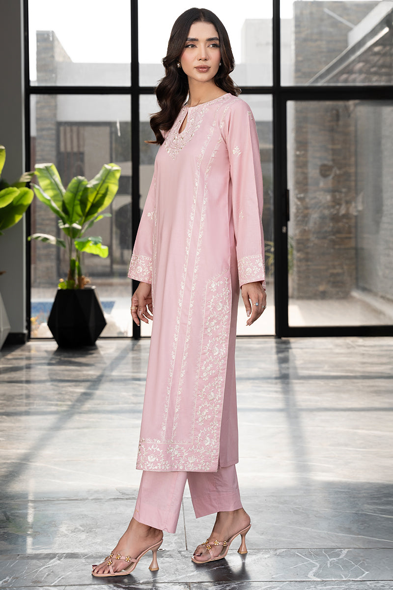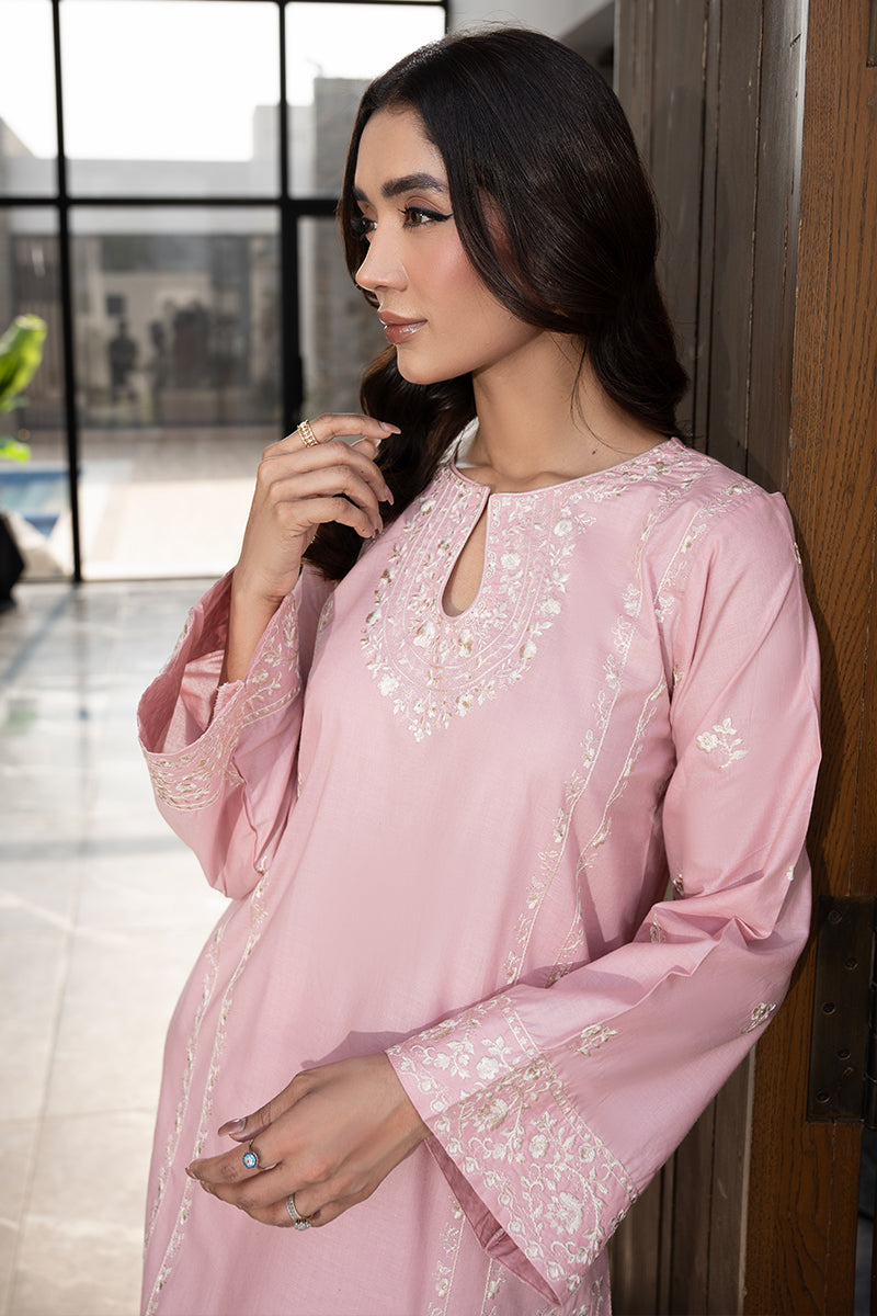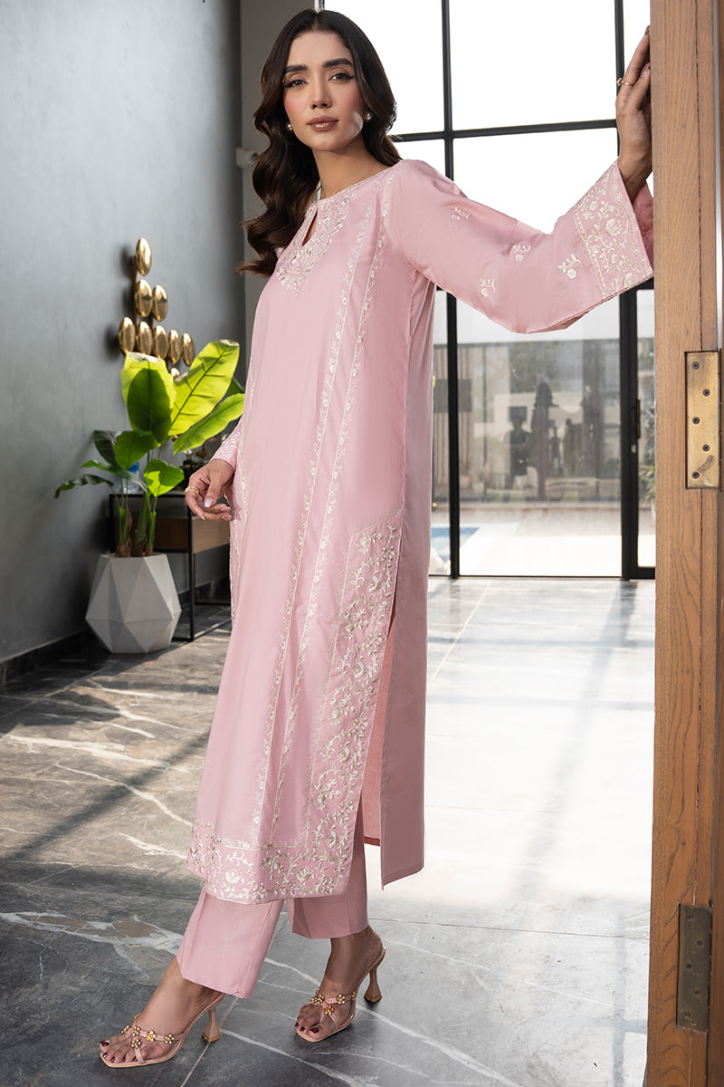 Expertly crafted in a stitched and unstitched two & three piece design,T.Pink boasts intricate embroidery borders on the front and sleeve embroidery The heavy embroidery on the neckline and daman elevate this dress to a true statement piece. Complete the look with the chiffon dupatta, also embellished with embroidery.