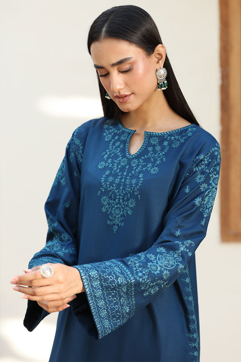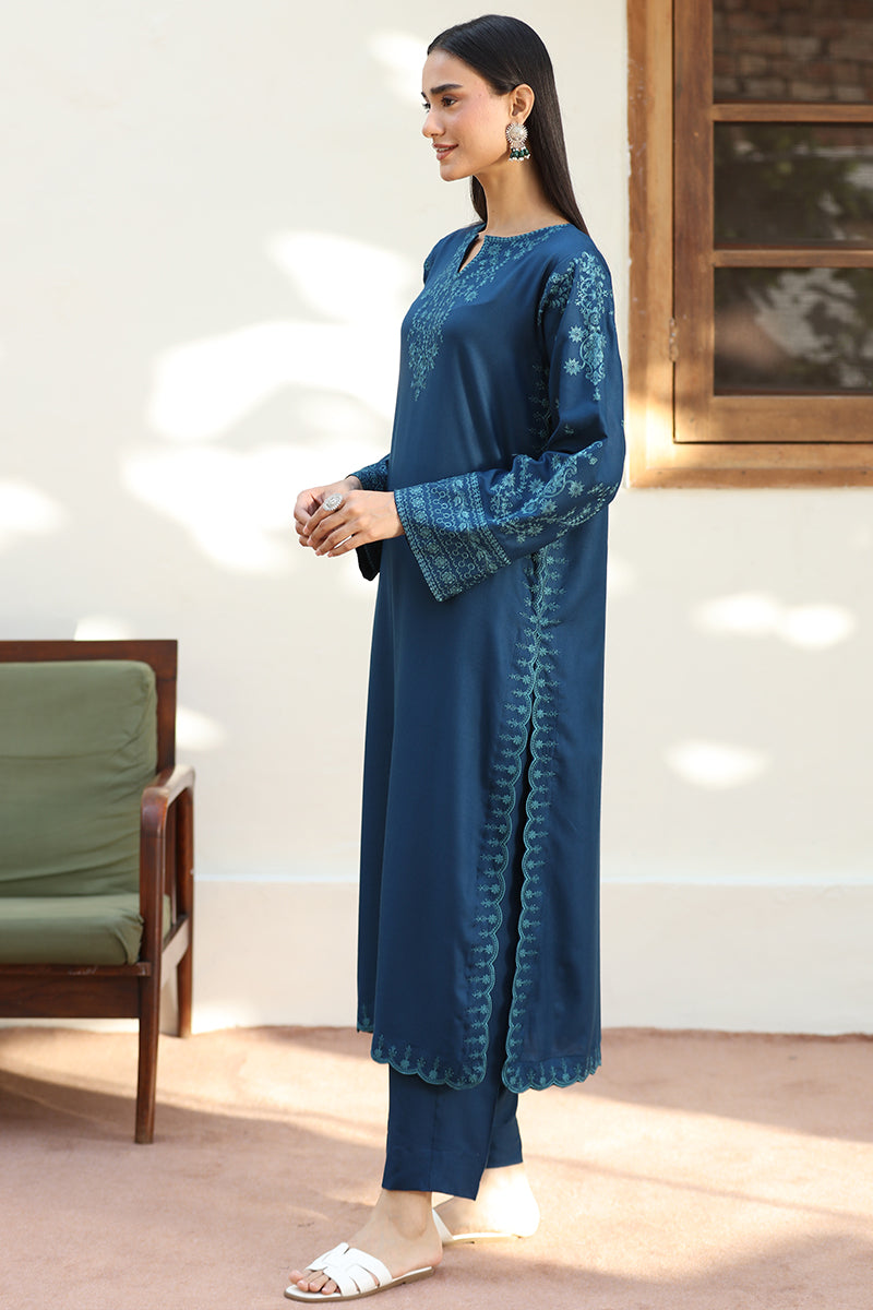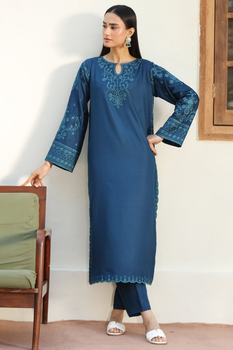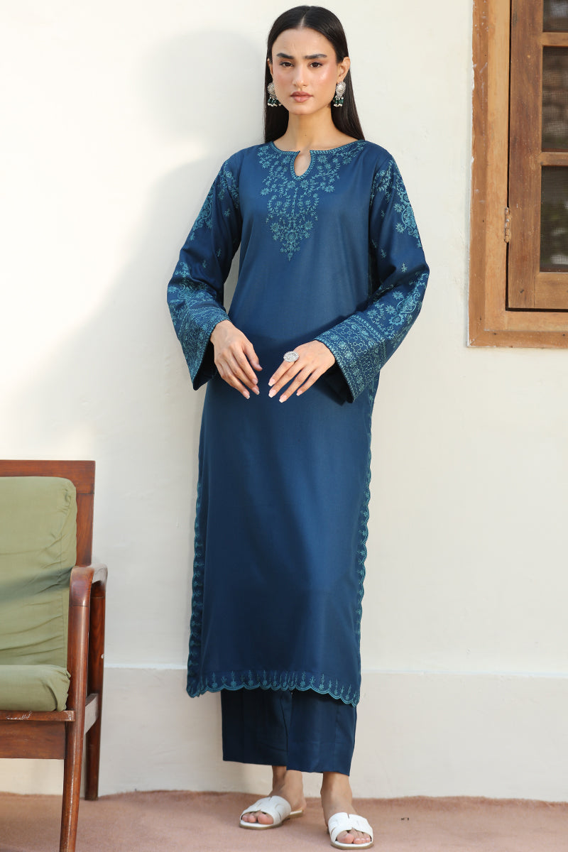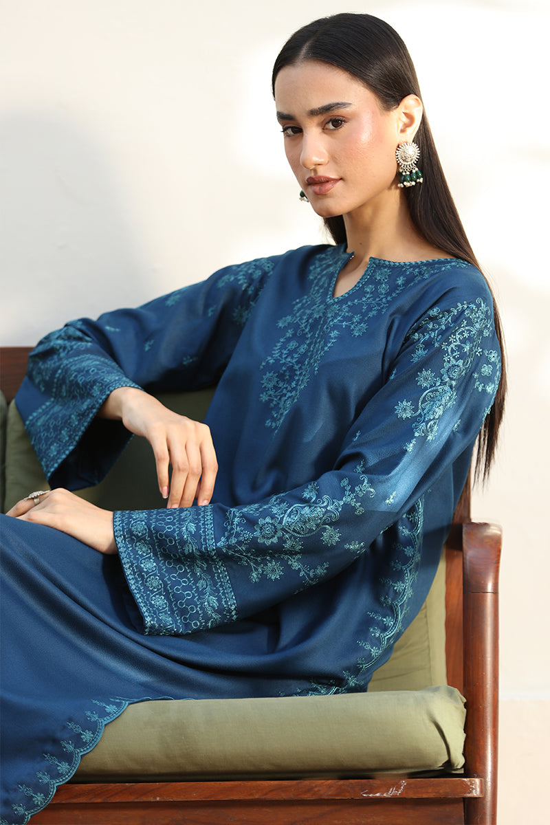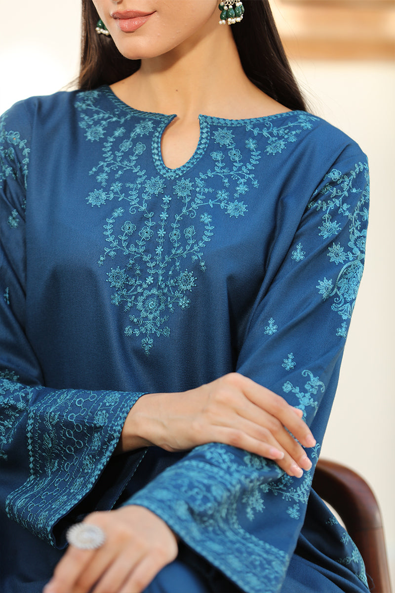 A bright, vibrant two-piece suit in a striking teal blue color. The straight-cut shirt features a keyhole neckline with intricate embroidery in shades of dark teal and aqua green. Similar bold, geometric and floral patterns decorate the cuffs and the lower hemline, while the rest of the shirt is kept solid, allowing the color and concentrated design work to be the focal points. The trousers are a matching solid teal.